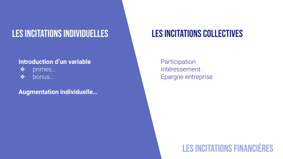 L’individualisation des salaires prend la forme d’incitations financières, par des versements d’argent en fonction d’un indicateur de performance (primes, commissions, augmentation individuelle…) versé de manière individuelle. On retrouve ici la logique de la théorie de l’équité et de la théorie des attentes. L’idée est d’offrir un gain à celui qui s’implique davantage, de manière juste et objective.