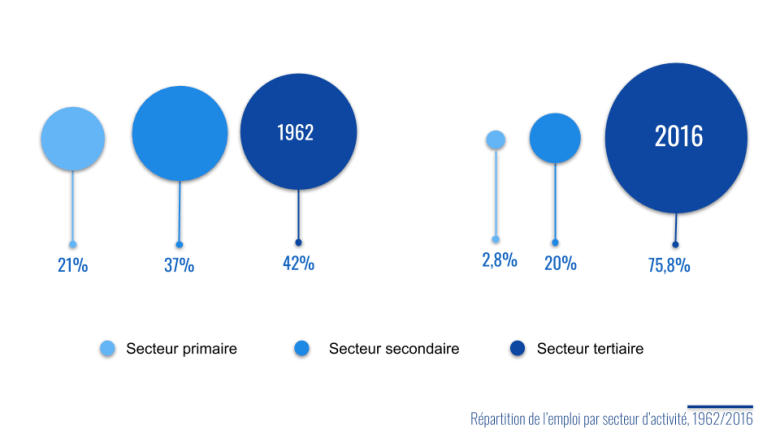 Le poids des secteurs dans l’économie française s’est fortement transformé, avec des sociétés tertiarisées, avec la forte chute de l’emploi dans le secteur agricole, et une désindustrialisation du tissu économique français.