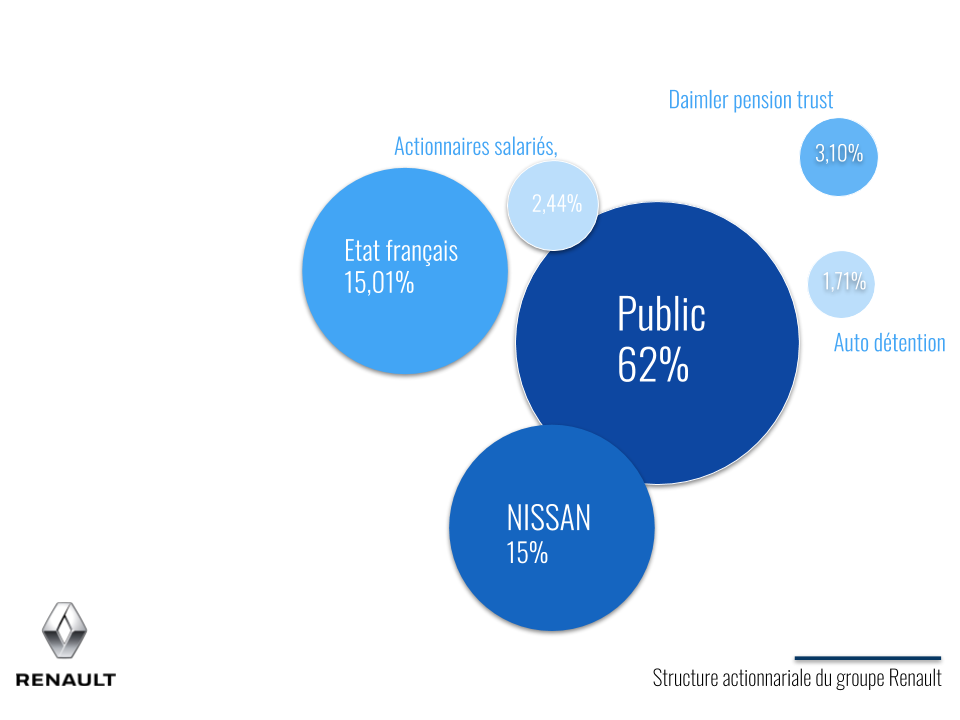 Une entreprise est considérée comme privée si la majorité de son capital social (actions ou parts sociales) est détenu par des personnes privées (personnes physiques ou organisations privées).Ainsi ci-dessous, l’actionnariat de Renault. La majorité des actionnaires sont de droit privé, or le dirigeant de l’entreprise est responsable devant ses actionnaires, qui doivent valider sa stratégie et confirmer ou non le maintien dudit dirigeant à ses fonctions, via la gouvernance de l’entreprise.
