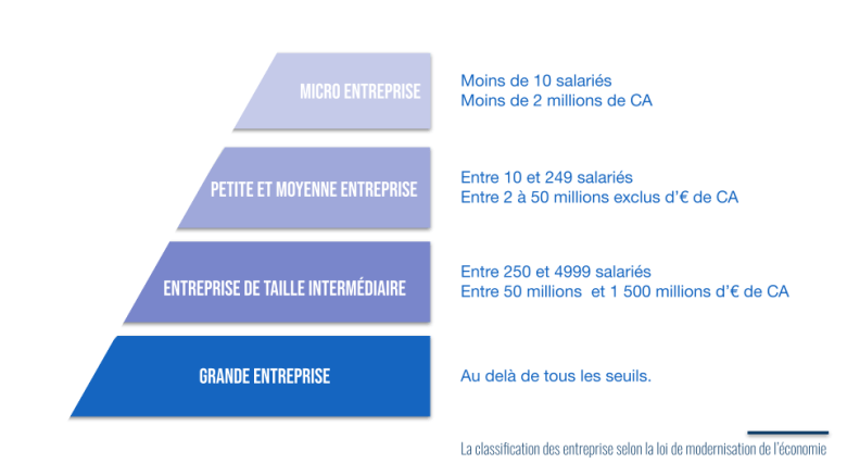 Pour les entreprises, les critères à retenir sont le nombre de salariés et le chiffre d’affaires. La loi de modernisation de l’économie de 2008 distingue les entreprises par taille sur les critères suivants: