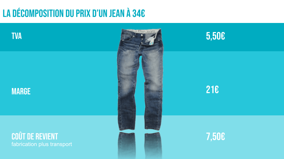 Ci-dessous, le prix moyen d’un jean importé est de 7,50€ pour un prix de vente de 30 à 35€.