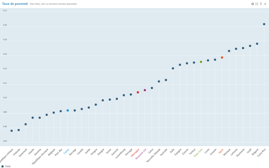 Dernier point, la pauvreté, qui est ici déterminée à 50% du revenu médian (montant de revenu qui divise une population en deux groupes égaux, la moitié ayant un revenu supérieur à ce montant, et l’autre moitié ayant un revenu inférieur à ce montant.)