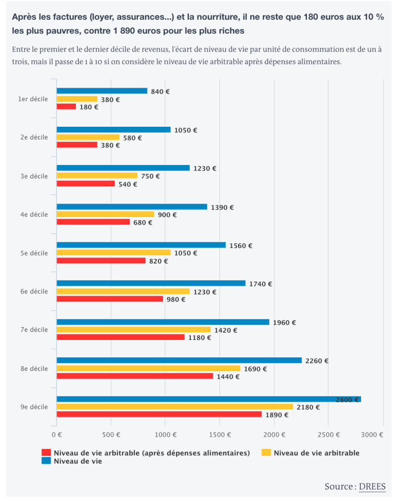 Cette part des dépenses contraintes limite l’arbitrage des ménages, et ce d’autant plus si le revenu disponible est bas. La DRES estime ainsi que les 10 % les plus modestes ne disposent en moyenne de 180 euros par mois pour financer transport, équipement, loisir ou habillement, contre 890€ pour le décile médian.