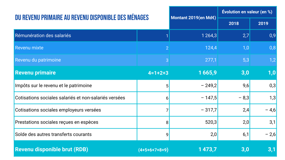 Les revenus des ménages ne sont pas uniquement issus des revenus primaires. Les revenus primaires correspondent aux revenus dont disposent les ménages du fait de leur participation directe à des processus de production (rémunération du travail) et les revenus qu’elles reçoivent d’actifs financiers ou de ressources naturelles en échange de leur mise à disposition à une autre unité institutionnelle. (INSEE)