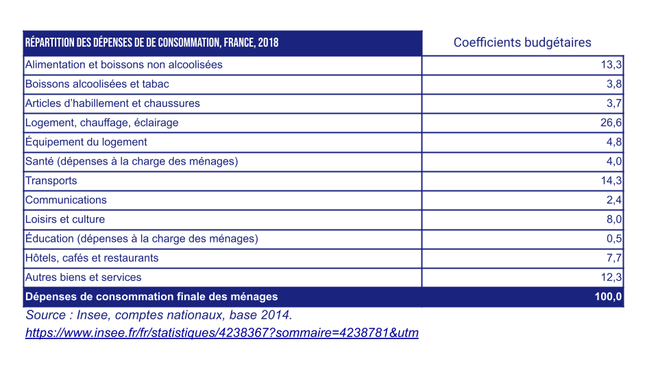 La consommation des ménages est répartie en différentes catégories de biens et services, dont l’affectation est déterminée statistiquement sous forme de coefficient budgétaire.
