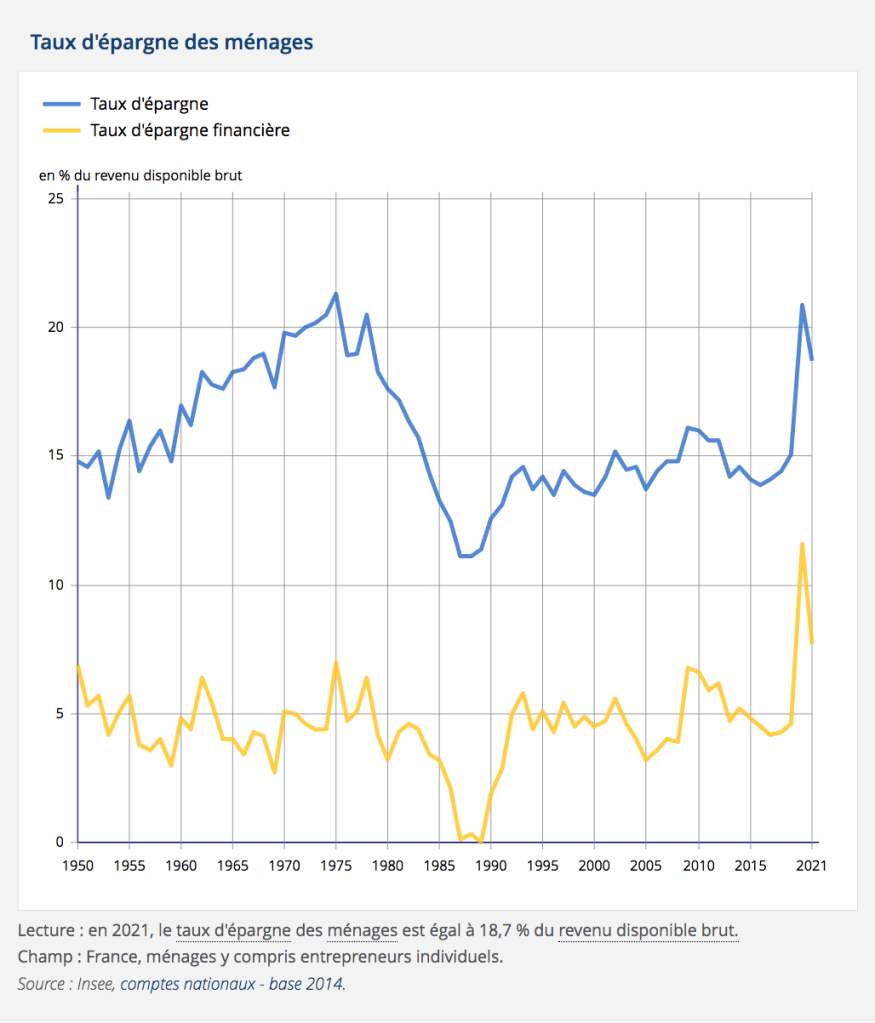 Ce taux est de 18,7% en 2021, et de 8% pour l’épargne financière. L’épargne financière est constituée des sommes d’argent déposées dans les établissements bancaires (compte courants), mais aussi des produits financiers (livrets, assurance vie, actions..) de placement.