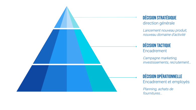 Plus on grimpe dans la pyramide, plus les données sont traitées, transformées et synthétisées en tableau de bord et indicateurs.