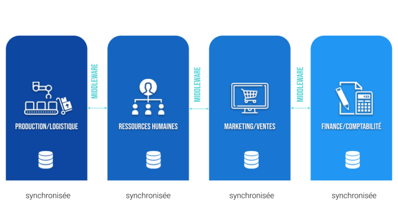Le middleware (ou intergiciel) est un logiciel tiers qui crée un réseau d’échange d’informations entre différentes applications quels que soient les ordinateurs impliqués et quelles que soient les caractéristiques matérielles et logicielles des réseaux informatiques, des protocoles réseau, des systèmes d’exploitation impliqués. Les bases de données métiers sont intactes, mais communiquent entre elles via des applications front end, c’est à dire des interfaces conçues pour les utilisateurs.