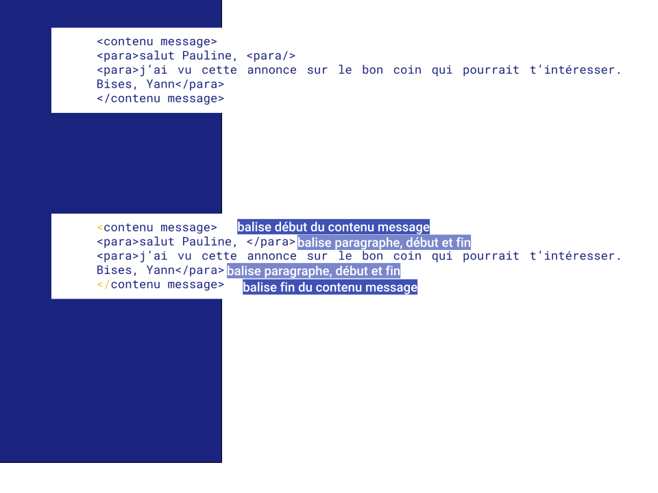 La balise contenu message indique le début et la fin du texte, la balise para le début et la fin du paragraphe.