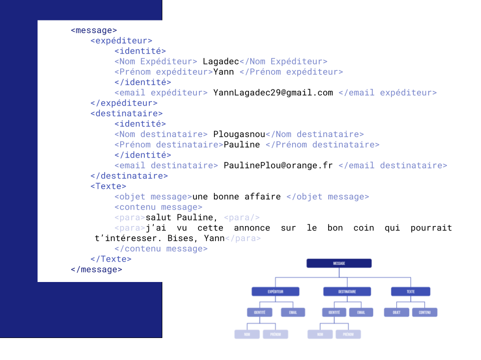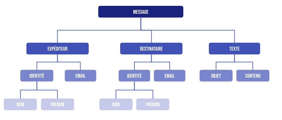 Toujours sur l’exemple du mail, l’ensemble des balises sera regroupé sous le noeud « message ». Première arborescence : l’expéditeur, le destinataire, le message. Chaque branche est ensuite décomposée.
