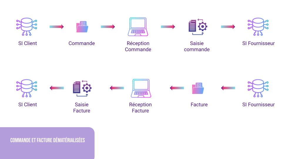 Dans un système “classique” entre deux entreprises, une entreprise va ainsi générer à partir de son système d’information une commande transmise à une entreprise fournisseur. Le fournisseur entre les données de la commande dans son propre système d’information, édite la facture et le bon de livraison puis les à l’entreprise cliente, qui les saisit à nouveau dans son système d’information dans le format utilisé par son système d’information. Ces envois peuvent être sous forme papier ou PDF, cela ne change pas la nécessité de saisir les données.