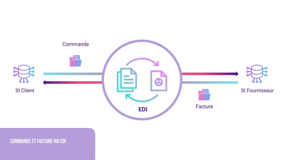Dans le cas d’un EDI, l’entreprise génère la commande de son système d’information, qui est ensuite cryptée en format EDI, transite par un fournisseur EDI, puis va être adressée au fournisseur. Le document est alors transposé du format EDI au format utilisé par le destinataire. La facture et le bon de livraison transitent par le chemin inverse. Aucune saisie d’information dans le système d’information n’est requise.