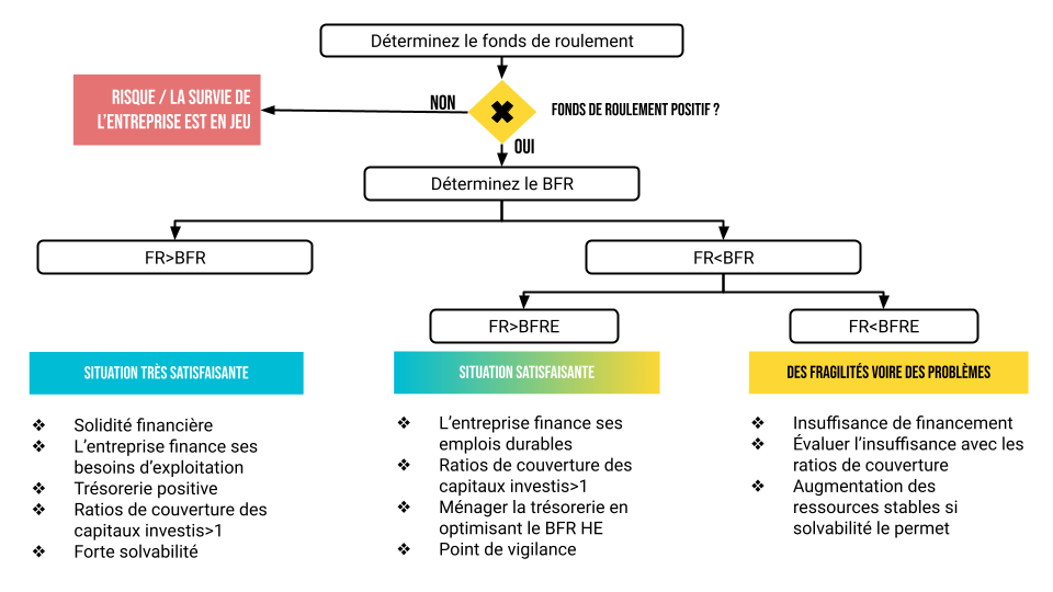 En effet, les ressources longues doivent financer les emplois longs (on n’achète pas une machine de 30 000€ à découvert pour vulgariser). Les ressources stables doivent également être supérieures aux emplois stables, cet excédent constitue le FRNG.