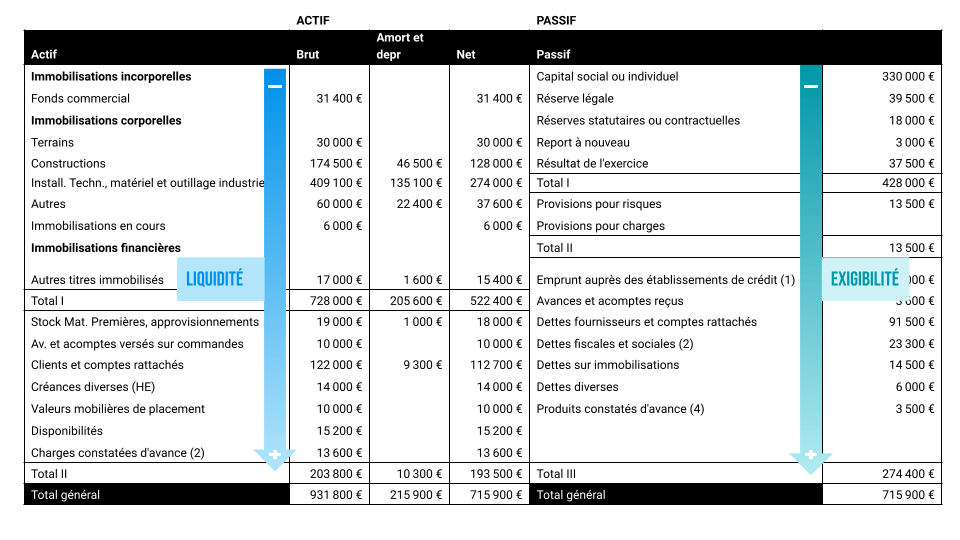 Le bilan tel que prévu par le plan comptable général est une méthode patrimoniale. L’actif détaille ce que possède l’entreprise, classé par ordre de liquidité, et le passif l’ensemble des capitaux mobilisés par l’entreprise (capitaux propres et dettes), classés par ordre d’exigibilité.