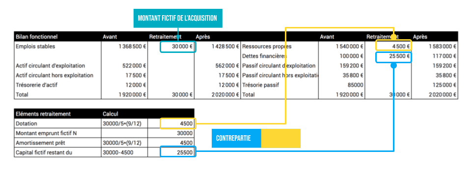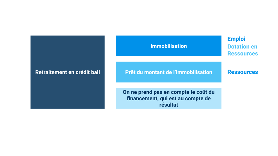 Premier retraitement, on impute une immobilisation aux emplois durables comme si l’entreprise en avait acquis la propriété, du montant de l’acquisition fictive. De la même façon, les dotations aux amortissements correspondant à cette immobilisation fictive sont imputées aux ressources stables.