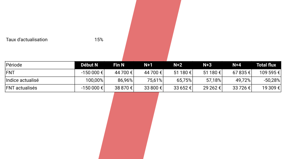 Par exemple, pour un taux d’actualisation à 15%, les données seront les suivantes :