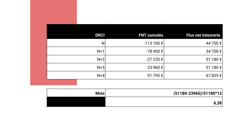 Pour déterminer le nombre de mois,, la VAN est de 23 960€, pour un flux net de 51 180. Par conséquent, 5 1180- 23960 = 27 220€ de FNT ont été nécessaire pour que le FNT soit égal à zéro, ce qui représente 27 220/51180 = 53% de l’année. Soit 6,38 mois.