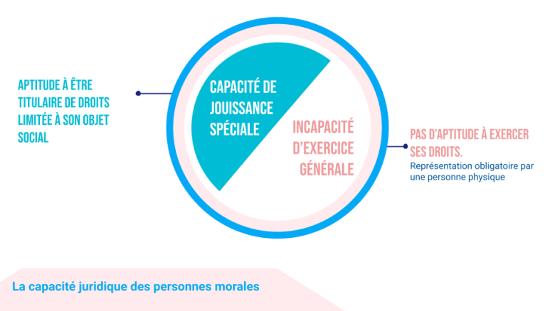 La personne morale ne possède pas de capacité de jouissance générale. (article 1849 du code civil : Dans les rapports avec les tiers, le gérant engage la société par les actes entrant dans l’objet social.)