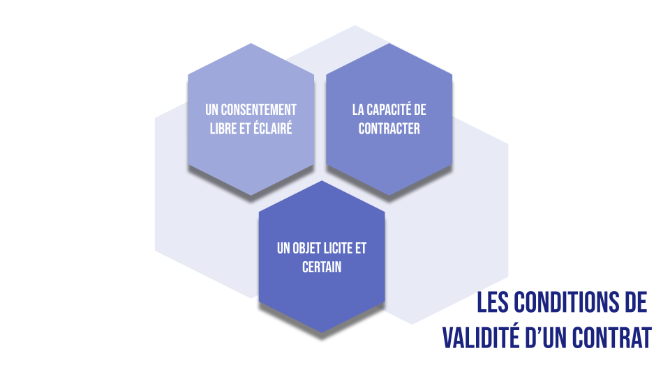 Bien que le contrat soit issu de la volonté des parties, et soit régi par la liberté contractuelle, trois conditions principales doivent être remplies pour que le contrat puisse exercer ses effets.