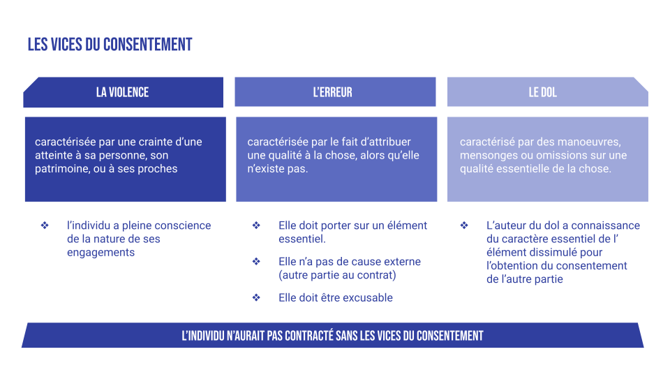 “L’erreur, le dol et la violence vicient le consentement lorsqu’ils sont de telle nature que, sans eux, l’une des parties n’aurait pas contracté ou aurait contracté à des conditions substantiellement différentes.” article 1130 du code civil.