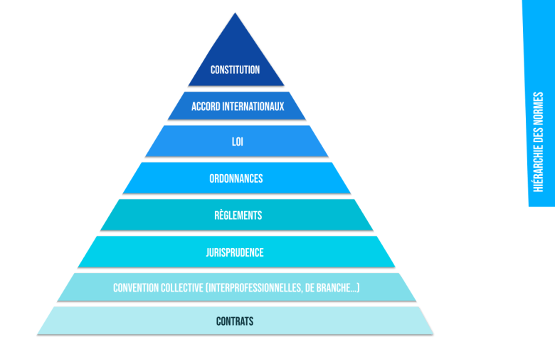 Le droit français est fondé sur la hiérarchie des normes. Les normes “basses” comme les décrets doivent être conformes aux lois, qui elle même doit être conforme à à la constitution. Le droit du travail n’y déroge pas. Les relations de travail, qu’elles soient individuelles ou collectives, sont régulées par ce principe.
