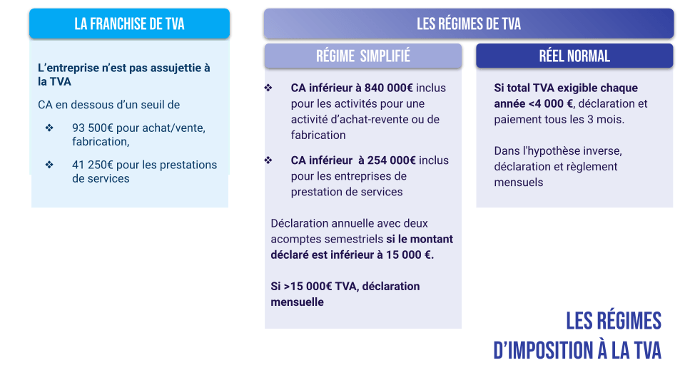 L’entreprise est soumise à une déclaration annuelle de TVA. Elle doit cependant effectuer deux avis d’acomptes provisionnels semestriels accompagnés d’un télérèglement.