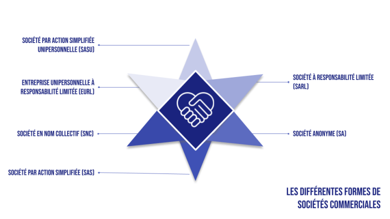 Les différentes formes de société commerciale sont énumérées par l’ article L210-1 du code du commerce. On y retrouve ainsi les sociétés en nom collectif, les sociétés en commandite simple, les sociétés à responsabilité limitée et les sociétés par actions.