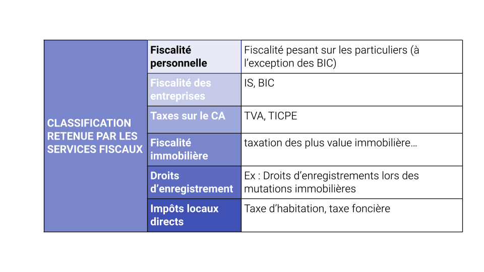 L’impôt peut être classé par nature de l’opération (classification économique), par son mode de collecte (classification administrative) ou selon la classification fiscale.