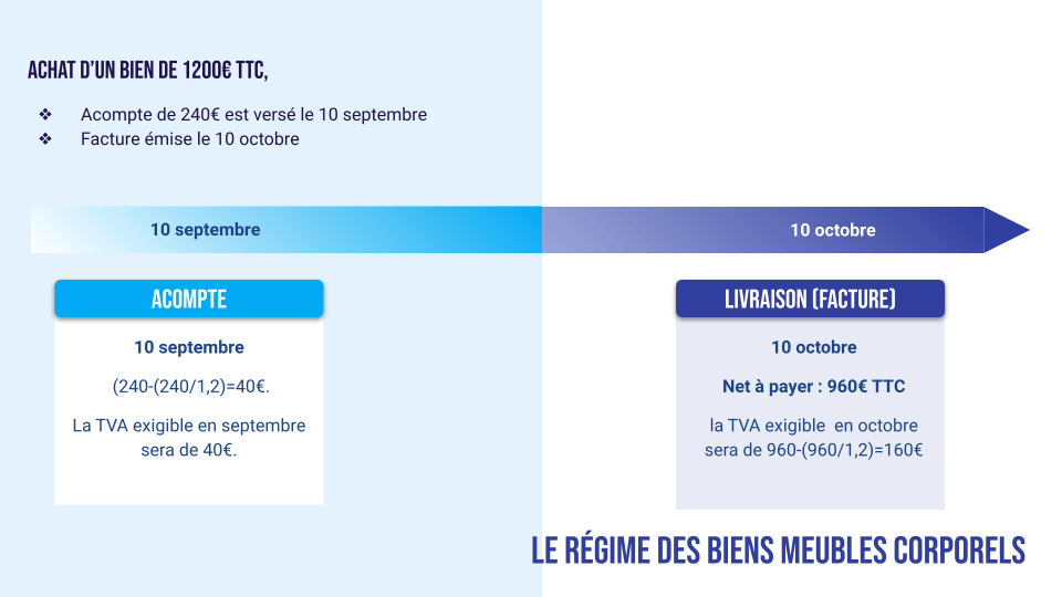 Dans la même logique, la TVA exigible sera de 960-(960/1,2)=160€, en octobre.