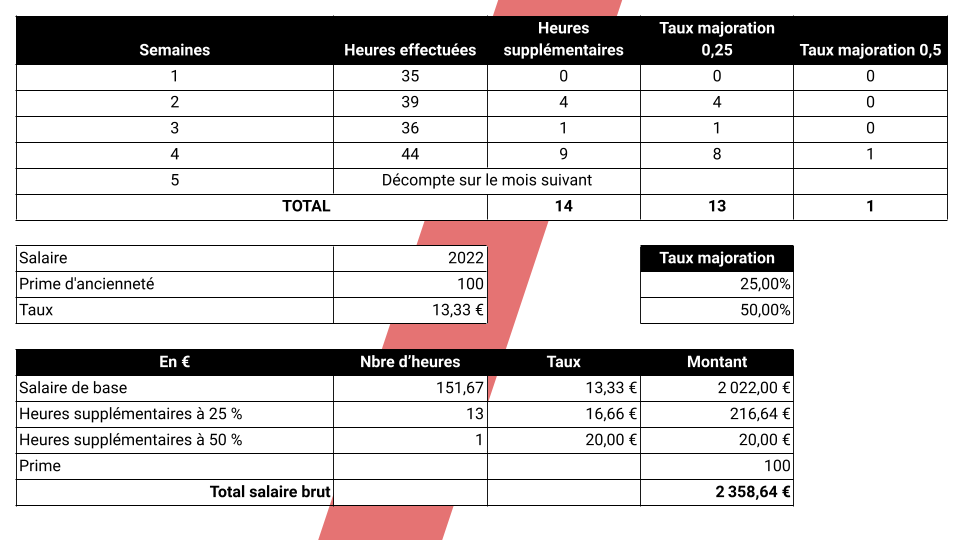 Lorsqu’une semaine est à cheval sur 2 mois, le paiement des heures supplémentaires est reporté sur la prochaine fiche de paie.