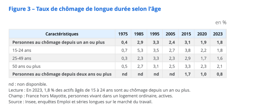 Ce chômage est lié à la structure du marché du travail, il n’est pas ou peu réceptif à la conjoncture. En 2023, il représente 1,8% de la population active, impactant davantage les jeunes et les plus de 50 ans.