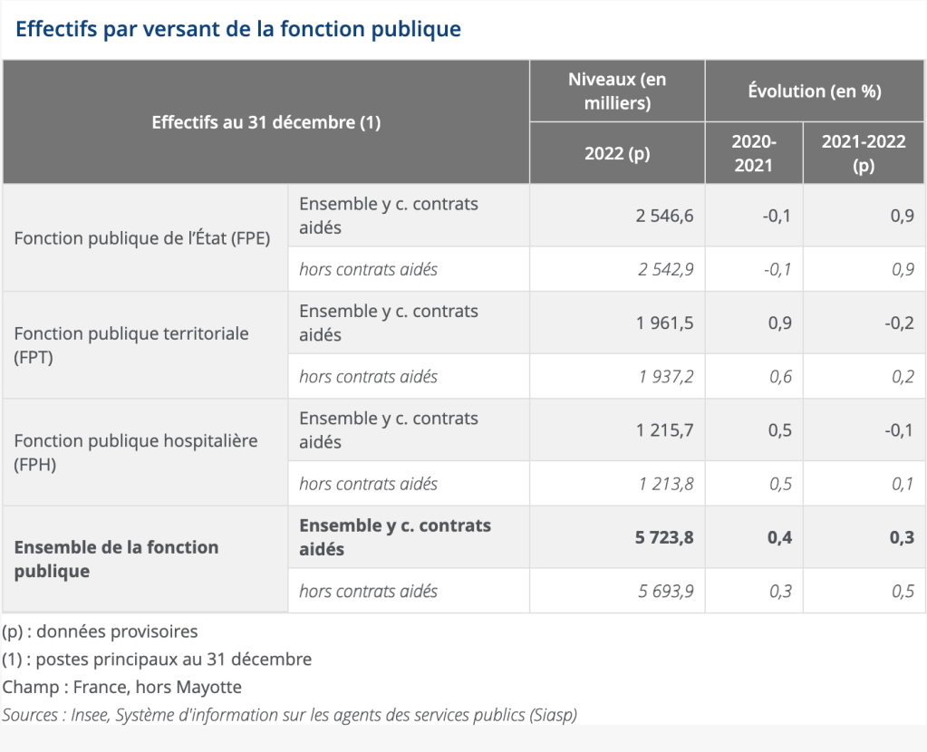 La fonction publique rassemblait 5,7 millions de personnes à la fin de 2022, soit 19 % de l’emploi total en France (salariés et non-salariés), contre 21% en 2020.