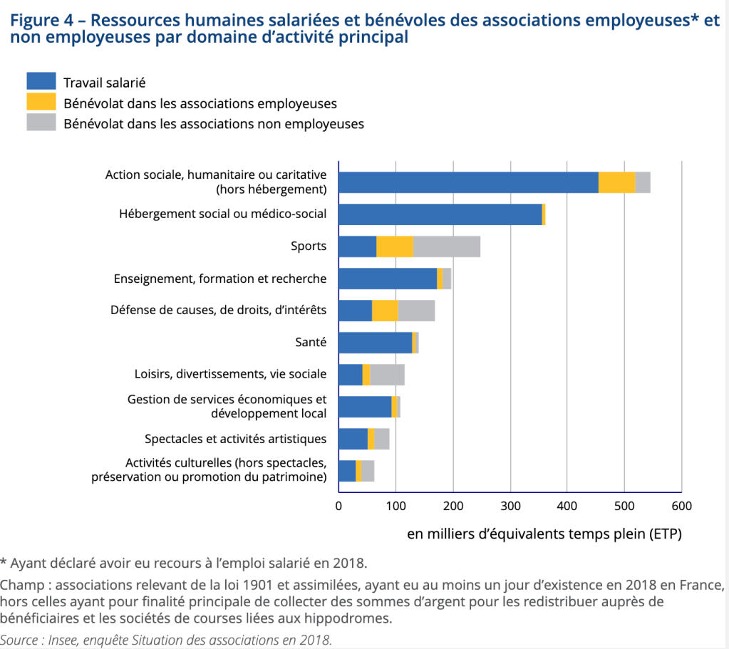 En 2018, en France, 170 000 associations sont employeuses et 1,1 million sont non employeuses. Elles fonctionnent grâce à 2,2 millions de salariés et 21 millions de participations bénévoles, un même bénévole pouvant s’investir dans plusieurs associations. Sur l’année, cela représente 1,5 million d’emplois salariés en équivalent temps plein et 580 000 équivalents temps plein bénévoles. La demande de travail y est déterminée par la capacité des associations à récolter des ressources financières à leur fonctionnement (subvention, mécénat, autofinancement, activité lucrative…)