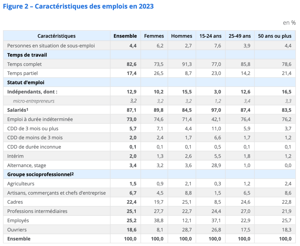 En 2023, en France hors Mayotte, 47,5% des personnes en emploi sont cadres ou professions intellectuelles supérieures (22,4 %) ou occupent une profession intermédiaire (25,1 %) contre 46,4 % en 2020; 43,8% sont employés (25,2 %) ou ouvriers (18,6 %), contre 45,0 % en 2020; 6,7 % sont artisans, commerçants ou chefs d’entreprise et 1,5 % sont agriculteurs exploitants.