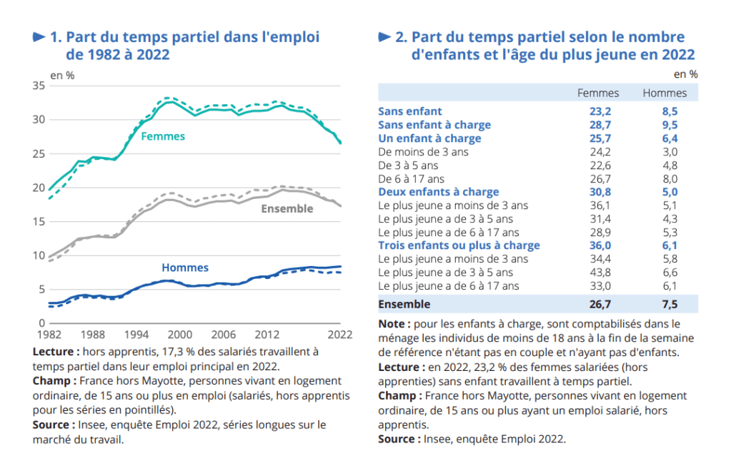 Cependant, en 2020, près de quatre salariés à temps partiel sur dix le sont parce qu’ils ne peuvent pas travailler davantage alors qu’ils le souhaitent. La durée moyenne du temps partiel est de 23,6 heures.