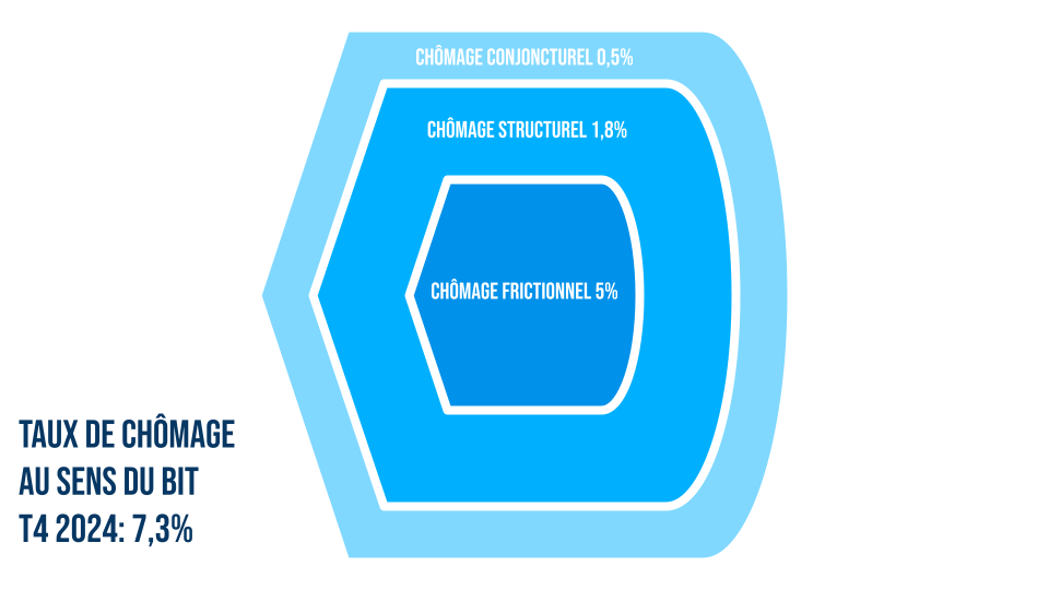 Mais cette situation de chômage est plus complexe qu’il n’y paraît. Elle se décompose en trois éléments, le chômage frictionnel, qui est un volume incompressible lié à l’appariement (délai de rencontre entre l’offre et la demande de travail), le chômage structurel (qui varie peu en fonction de la conjoncture économique) et le chômage conjoncturel, lié au cycle économique. Identifier les différents types de chômage est donc indispensable pour déterminer les réponses économiques et politiques les plus adaptées pour lutter contre ces différents chômages. Pour simplifier, on peut considérer le chômage comme un oignon, dont le coeur est le plus rigide.