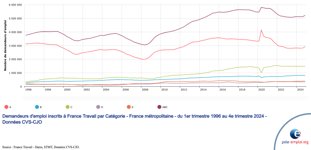 La définition du chômeur en catégorie A selon Pôle Emploi est plus large en supprimant le critère de disponibilité, et en prenant en compte les travailleurs à temps partiel (catégorie B et C).