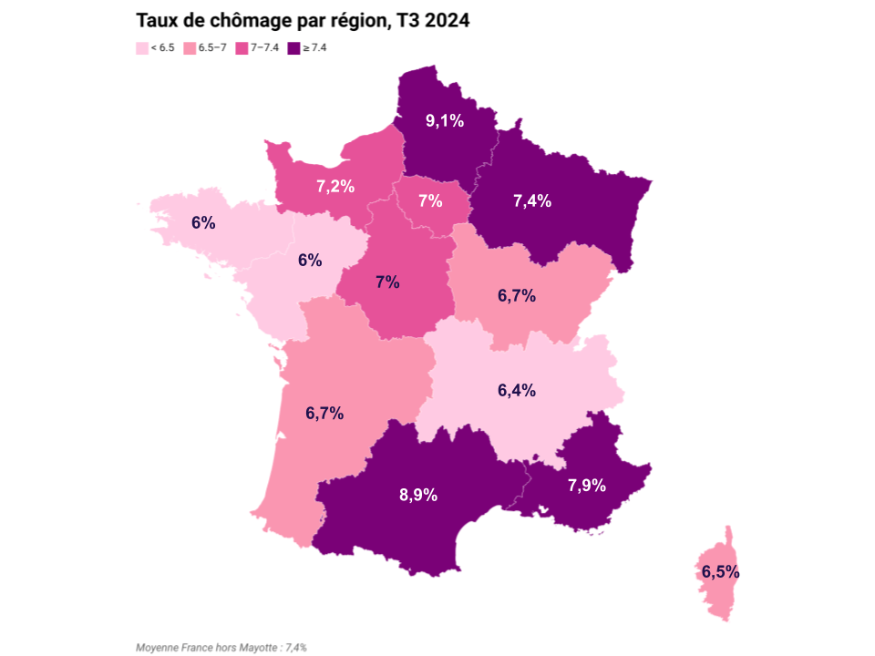 Le lieu de résidence, et le bassin d’emploi correspondant est également déterminant. Ainsi les régions françaises sont différemment impactées par le chômage, les Hauts de France, l’Occitanie et la région PACA présentent des taux de chômage points plus élevés que l’Ile de France, l’Auvergne-Rhône Alpes.
