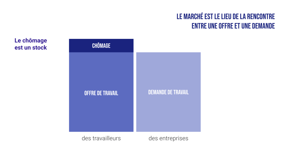 D’un point de vue économique, le chômage se révèle un stock d’offres de travail. L’offre est supérieure à la demande d’emploi, donc ce surplus est disponible comme un stock de marchandises l’est pour un commerçant.