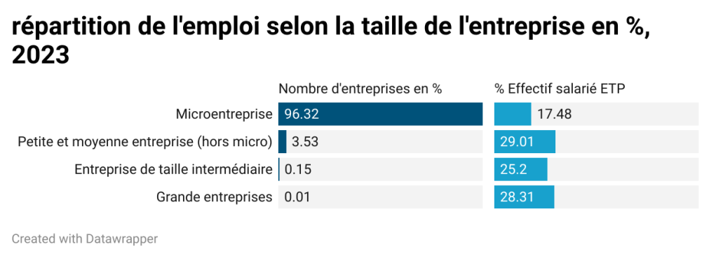 294 grandes entreprises emploient 4,2 millions de salariés en équivalent temps plein (ETP), soit 28 % du total, quand 4,3 millions de micro entreprises emploient 2,6 millions de salariés. 6 600 entreprises de taille intermédiaire (ETI) et 159 000 petites et moyennes entreprises (PME) hors microentreprises emploient respectivement 25 % et 29 % des salariés. Par conséquent, la demande d’emploi est concentrée sur un nombre restreint d’entreprises, dont l’implantation influence la demande d’emplois.