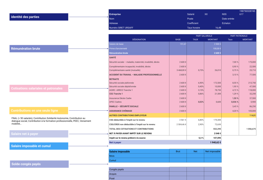 - rendre lisibles les informations essentielles : rémunération brute, cotisations sociales obligatoires et facultatives, net à payer, impôt sur le revenu prélevé à la source.