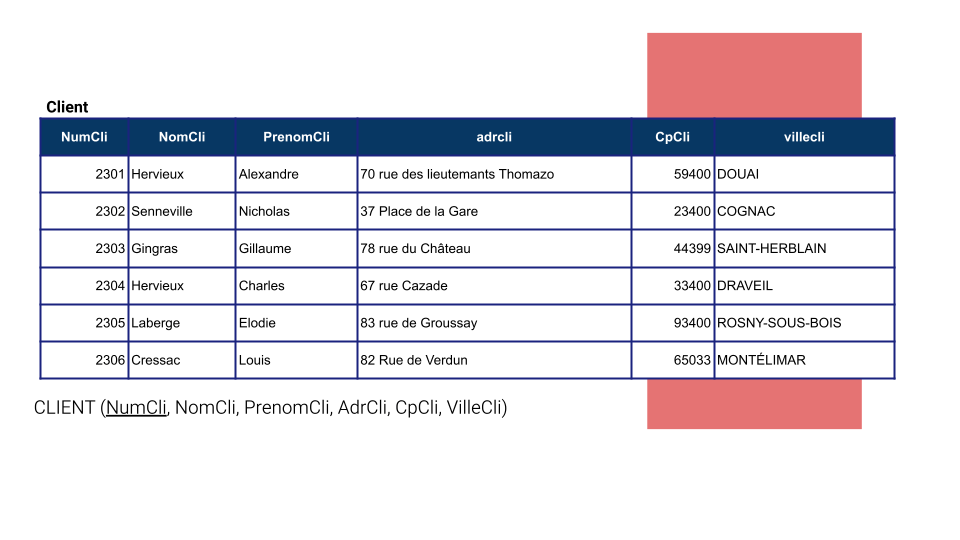 Par exemple, pour une relation CLIENT (NumCli, NomCLi, PrenomCli, AdresseCli, CPCli, VilleCli),