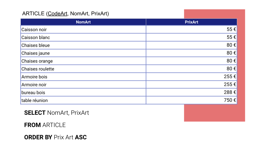 Si je reprend l’exemple précédent, à propos de la relation ARTICLE (CodeArt, NomArt, PrixArt), je souhaite obtenir le nom des produits et leurs prix, mais je souhaite aussi que les résultats soient triés par ordre de prix croissant