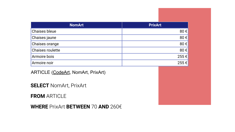 Par exemple pour la relation ARTICLE (CodeArt, NomArt, PrixArt), je souhaite obtenir uniquement le nom des produits et leurs prix, si le prix est compris entre 50€ et 260€.