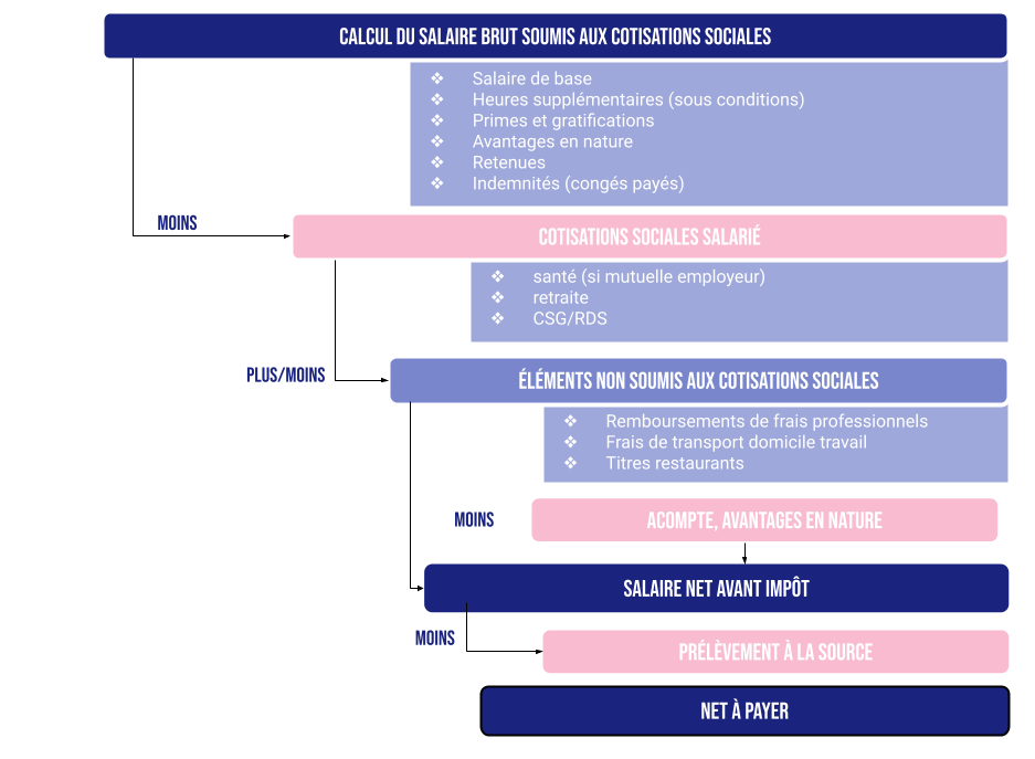 = salaire brut – cotisations sociales salariales + remboursement frais professionnels – avantages en nature – acompte versé