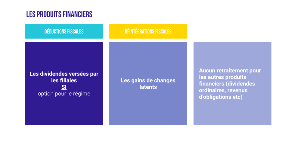Les produits financiers sont imposables au titre de l’IS, à l’exception des dividendes versés par une filiale si la société a opté pour le régime mère fille. Autre retraitement à effectuer, les gains de change latent sont à réintégrer