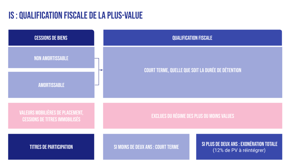Concernant les titres de participation, les plus values réalisées pour les titres détenues sont complètement exonérées. 12% du montant de la plus value est cependant à réintégrer au résultat fiscal