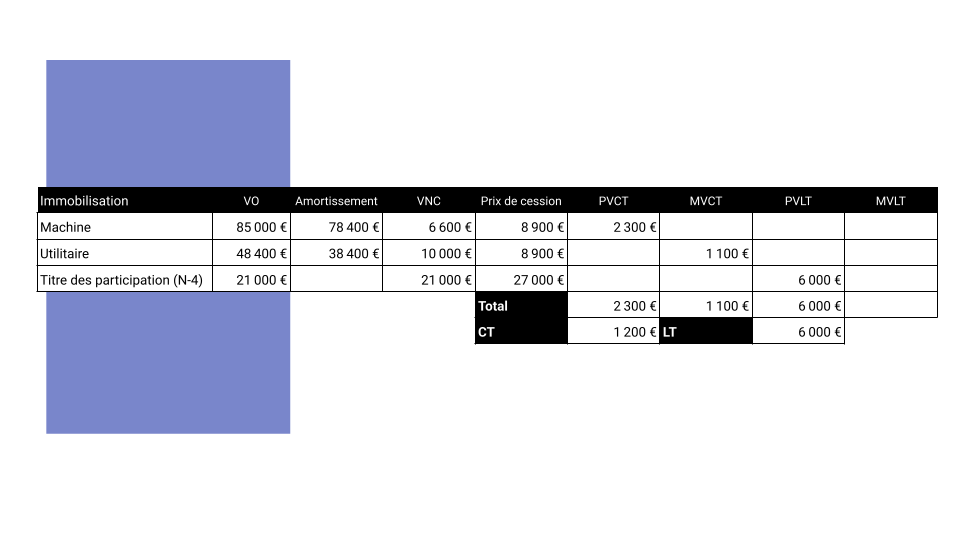 La plus-value (PV) ou moins-value (MV) se calcule élément par élément.